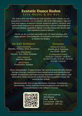 Ein eingespielter Kern von professionellen MusikerInnen begibt sich auf eine Klangreise von 2 bis 3h. Mit verschiedensten archaischen Instrumenten und einer von ganzem Herzen stimmungsvolle, persönliche Atmosphäre, laden wir Dich zum tanzen ein, Dich zu erfahren und mit uns gemeinsam durch verschiedenste Welten zu reisen.