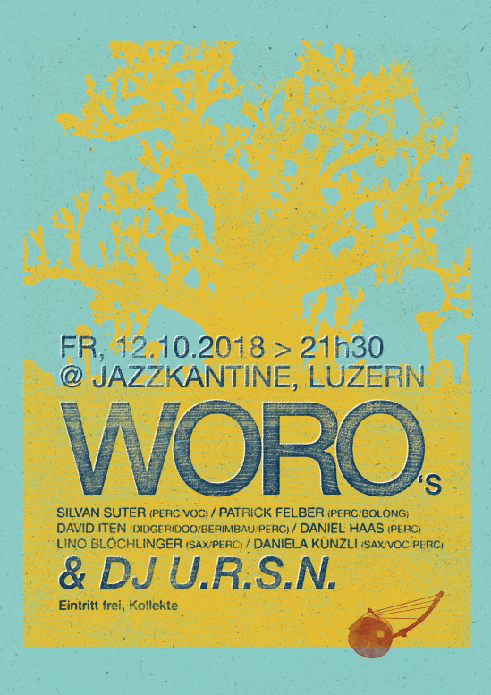 WORO's steht für eine Truppe von MusikerInnen, (zT. bekannt von Fischersmanns Orchestra und WoodVibes) welche sich einem erdigen und unbedingt tanzbaren Sound verschrieben haben. Klanglich basierend auf westafrikanischen Trommeln und angereichert mit vielfältigem Instrumentarium wie Saxofon, Berimbau, Stimme und Didgeridoo, kreieren die 6 MusikerInnen eine explosive Mischung aus traditionellen Rhythmen, satten Bläsersätzen und sphärischen Klängen, welche das hörende und tanzende Publikum auf eine Reise in unbekanntes Gefilde führt.